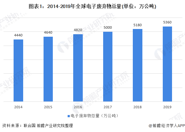 2014-2019年,全球電子廢棄物總量不斷增加。《2020年全球電子廢棄物監(jiān)測(cè)》報(bào)告顯示,2019年全球產(chǎn)生的電子廢棄物(帶電池或插頭的廢棄產(chǎn)品)總量達(dá)到了創(chuàng)紀(jì)錄的5360萬公噸。