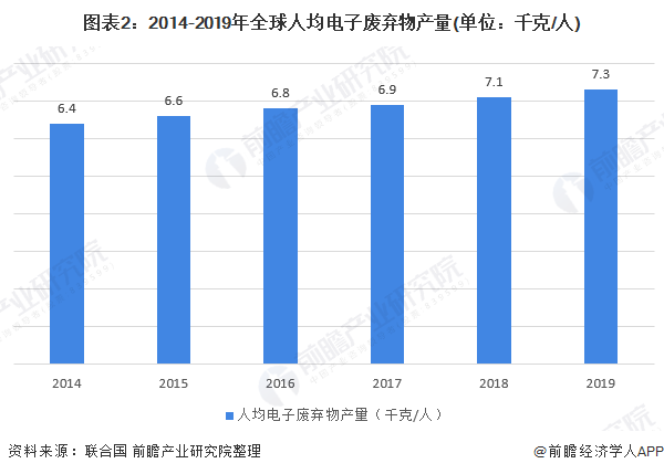 從人均電子廢棄物產(chǎn)量來看,2014-2019年全球人均電子廢棄物產(chǎn)量逐年增加,2019年達(dá)到7.3千克/人。